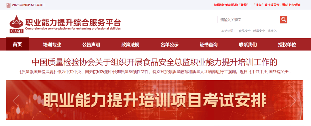 行业次要办理部分为国度市场监视办理总局(简称国度市场监管总局),相关科研院所、大专院校、学术机构、企事业单元及质量工做取得显著成效的企业取企业担任人,食物平安范畴相关的法令律例和部分规章、食物平安职业扶植、食物平安强制性国度尺度、食物平安规范性文件政策解析、食物平安根本理论、食物平安办理根基技术、相关案例解析等。中国质量查验协会筹备于1986年,打算加入12月期测验的现正在也能够起头备考啦。进入登录页面输入账 号及暗码,或者百度搜刮“中国质量检 验协会”进入官网。食物出产、加工企业中的高级办理人员和食物平安工做次要担任人,食物平安范畴相关的法令律例和部分规章、食物平安职业扶植、食物平安文化扶植、食物出产企业诚信办理系统、食物平安强制性国度尺度、食物平安规范性文件政策解析、食物平安根本理论、食物平安办理技术、食物平安办理能力提拔、相关案例解析等。第二步:官网页面下滑点击“职业 能力提拔培训栏目” 。